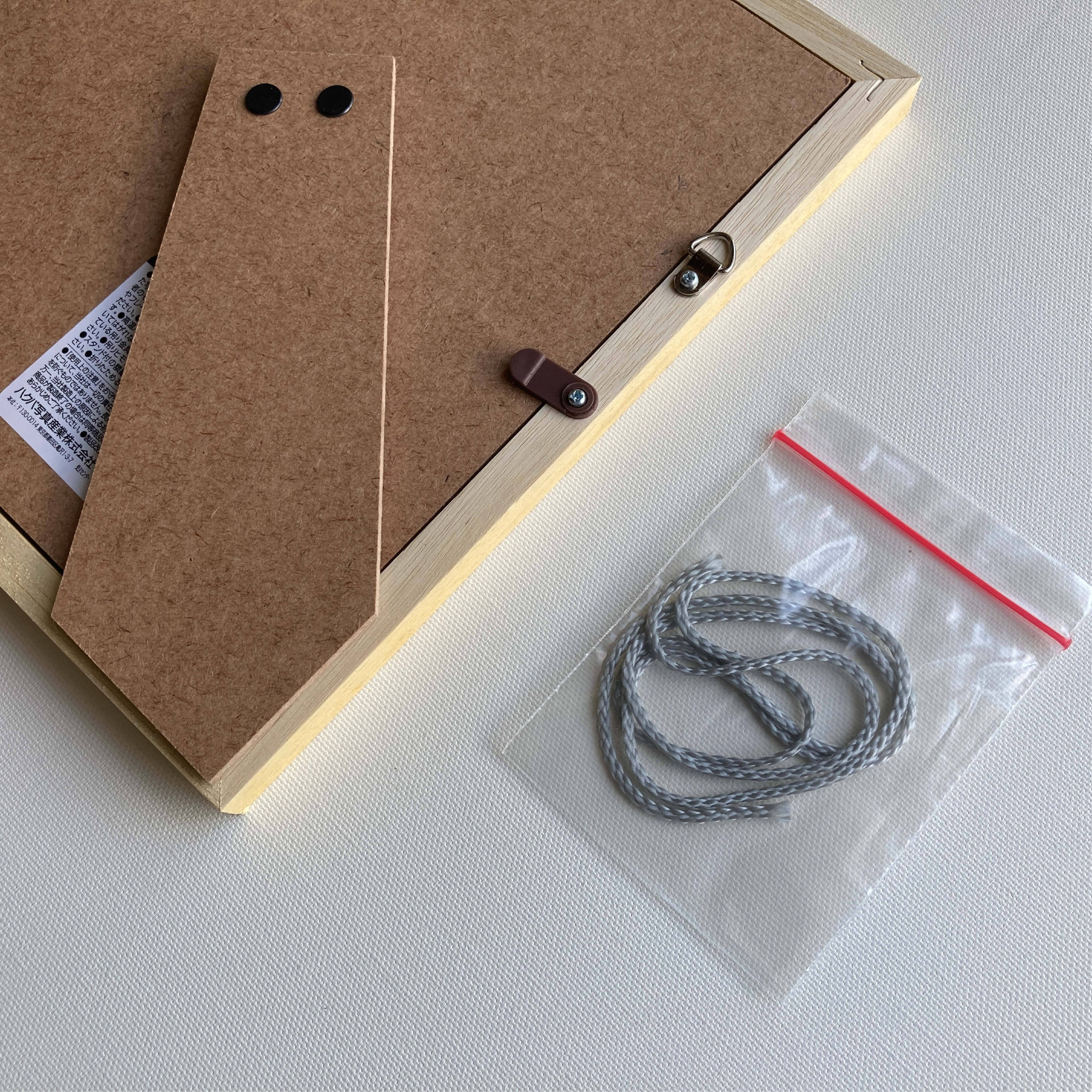2. 裏面は壁面に掛ける紐が付属、スタンドで立て掛けも可能